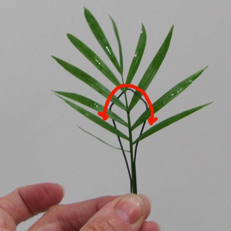 Taking a green florist wire, bend it into a wide hairpin curve that loops behind the palm branch, giving it support.