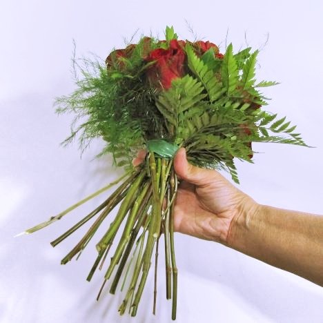 This fern has a lovely natural curve that can be used to advantage. At this point, don't worry about crossing the stems - simply lay it straight up and down against the finished bouquet.