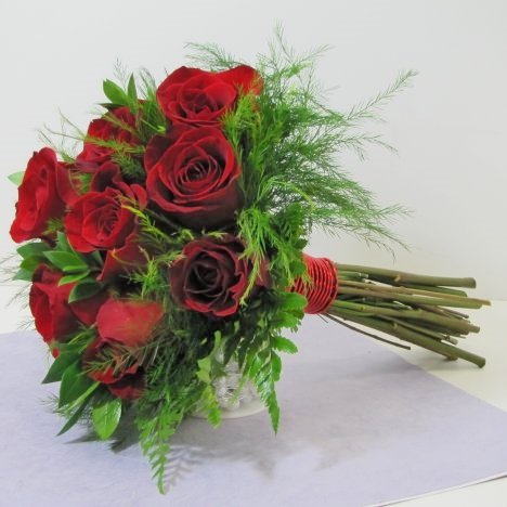 A hand tie bouquet is typically finished with a ribbon wrap of some kind. The only backdraw to a ribbon is that it should be done at the last minute, right before taking the flowers to the church.