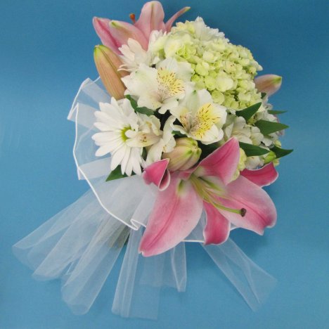 The final step to this hand tied bouquet is l a traditional hand tie with a lovely sheer or lace collar peeking out from under the flowers.