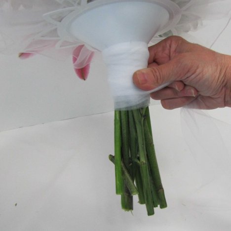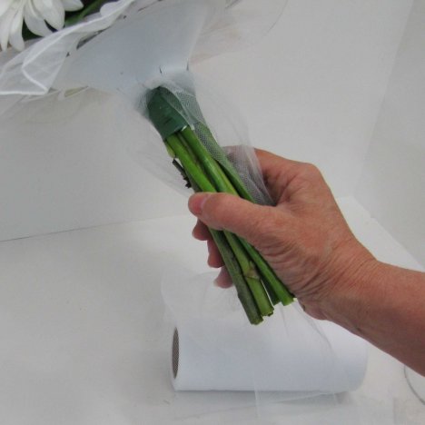 Want to finish this hand tied bouquet differently? Another alternative would be nylon tulle. Tulle doesn't absorb water and doesn't show damp spots or soiling like a satin ribbon would.
