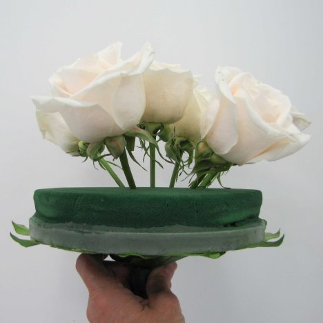 Although European holders were designed to help make flattened pave designs easier, I have found that I can use this large holder to create traditional (more rounded shape) bouquets. It distributes the weight and allows the insertions of very large flower woody stems (hydrangeas, sunflowers, etc.) without destroying the foam head.