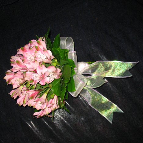 This finished clutch bouquet has a nice, slightly mounded appearance, with the green leaves of the collar finishing off the underside and a sheer bow at the bottom.