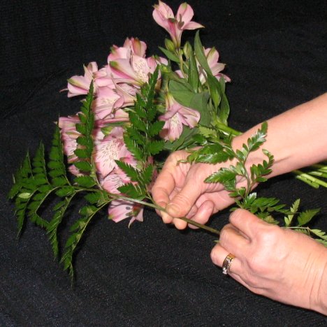 Face the "right side" of the leaf upwards and place it against the stems of the bouquet.