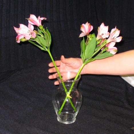 For hand tied bridal bouquets to have the flowers flare out in a circular pattern, you need to give balance to the placement of each stem.Place the second stem of flowers on the opposing side Take note of the the stems are crossed right about where the neck flares out to create the rounded shape of the vase.