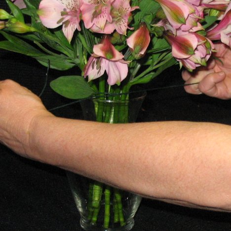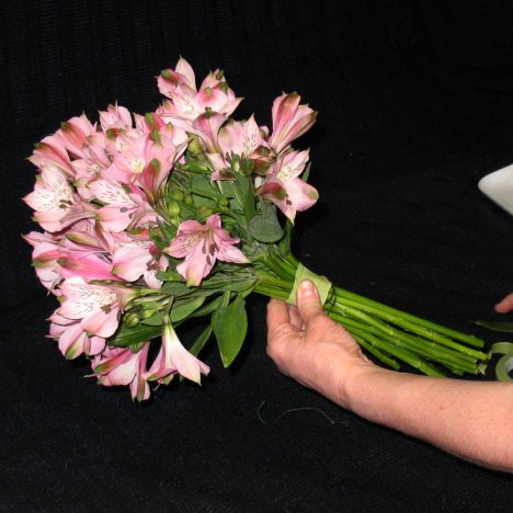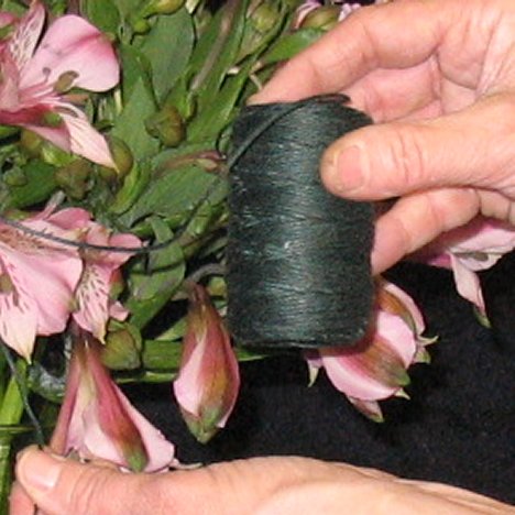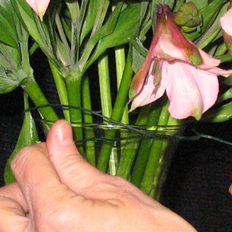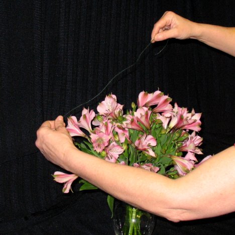 If you don't have help, imply cut a generous length of the wax string and encircle the bouquet with it while the flowers still rest in the vase.