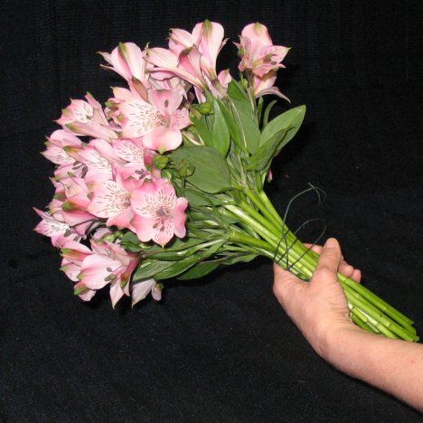 You can do this two ways. If you have a helper, you can gently encircle the stems with both of your hands and lift them out of the vase. Tighten your grip until the flowers are firmly pushed together and be sure the stems look the way you want. If they are all in place and look good, have your helper tie off the flowers with the wax string.