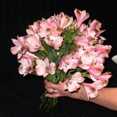 I'm using waxed string to tie off this hand tied bridal bouquet. The wax is gentler on the stems and won't cut the flower stems in two. An Oasis product is called BindIt. It works on hand ties as well. It is a little trickier to manage, but makes a smooth, tight seal that is flatter and smoother under ribbon wraps.