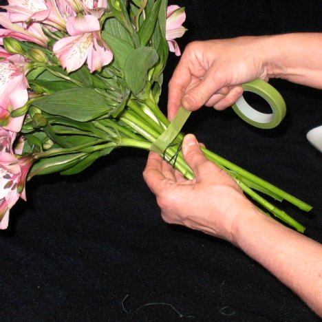 Wind it around and over the string, pulling gently so that the tape adheres to itself and stays fastened tightly on the bouquet handle.