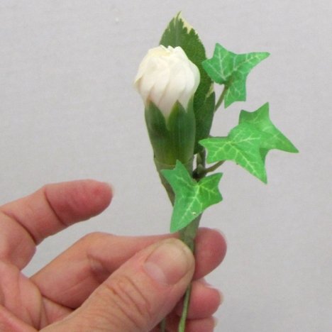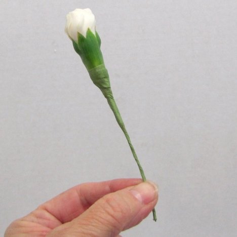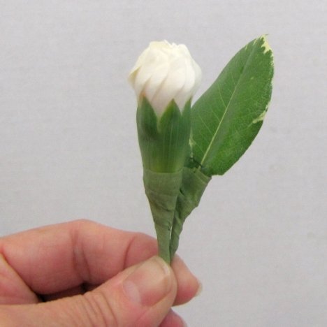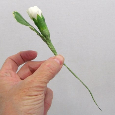 I place a wired pittosporum leaf behind the tight carnation bud and taped the two stems together.