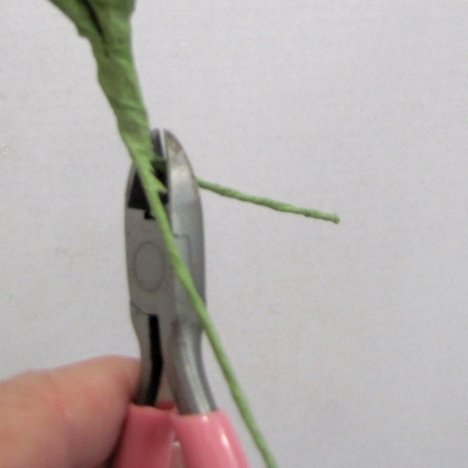 You can see by a side view that the leaf extends slightly beyond the tip of the flower head. The wired stems are going to come in handy as I later bend and manipulate the flower heads in the direction I want them to face.
