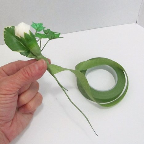 I rarely tape down the entire stem - instead I cut away excessive wire, working to keep my corsage stem as slender and pliable as possible while still making sure they are tightly taped together.