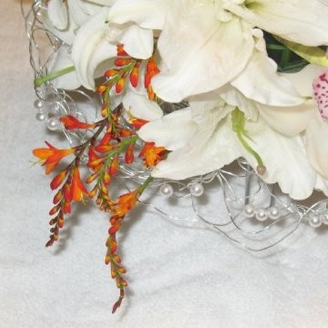 Orange crocosmia is a delicate, star-like flower grown on a slender stem. I'm using just a few stems in this bridal bouquet because the bride's colors are hot pink and bright orange. I didn't want, however, to overpower her bouquet with too much orange. This little filler flower worked perfectly. I also used it in the bridesmaid's bouquets and the groomsmen boutonnieres.