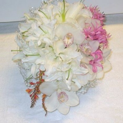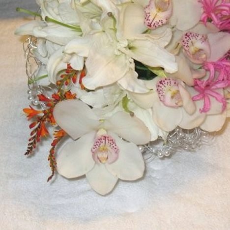 I also tucked a few sprigs of crocosmia directly under the orchids and nerine lilies. I put some in a small cluster in the upper left of the bouquet as well. You can see how just a hint of orange in the bride's bouquet pulls all the flowers together without overwhelming the bouquet with orange.