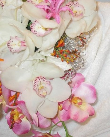 I insert one more cymbidium orchid here as well, again overlapping the wire collar.