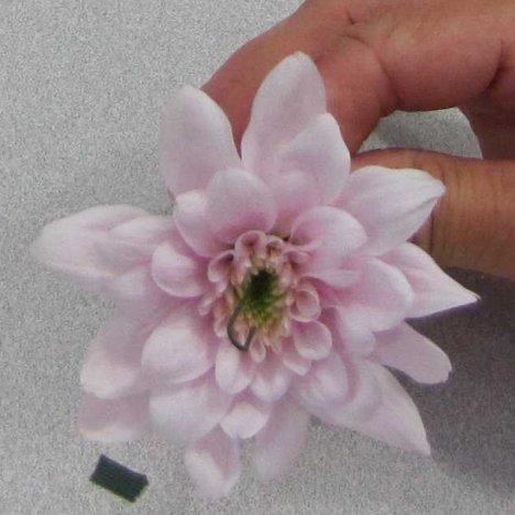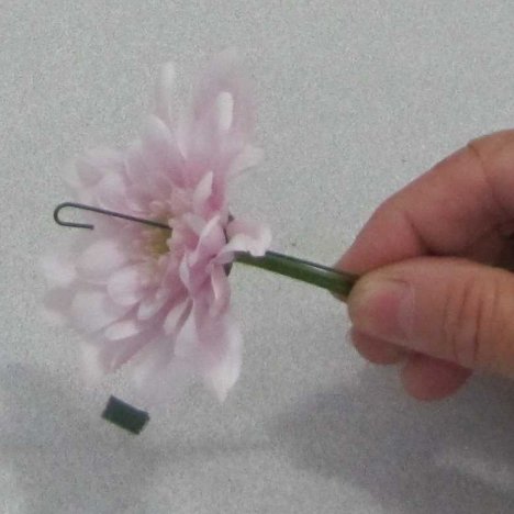 Continuing our boutonniere instructions, you will need to use green stem wrap to cover and support the hairpin wire you just inserted up into the mum flower head.
