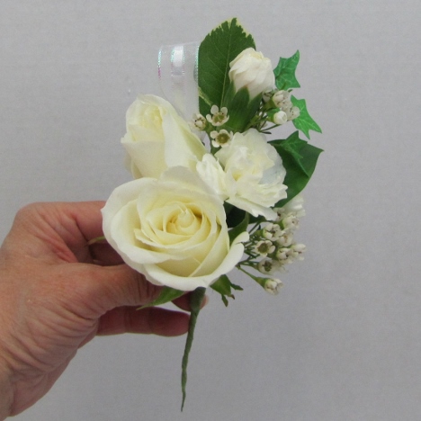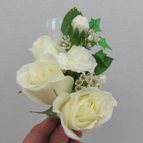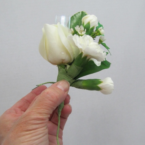 Here is the corsage assembled so far. Nice point at the top, with the secondary flowers complimenting the focal rose.