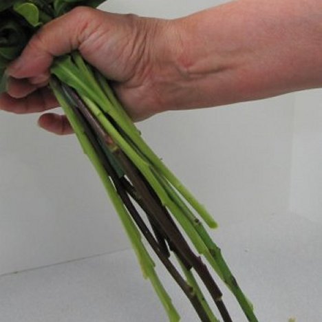 Be sure the stems are clean and free of thorns and dirt. I like leaving some of the leaves at the top - it helps contribute to the look of a true hand tied bouquet.
