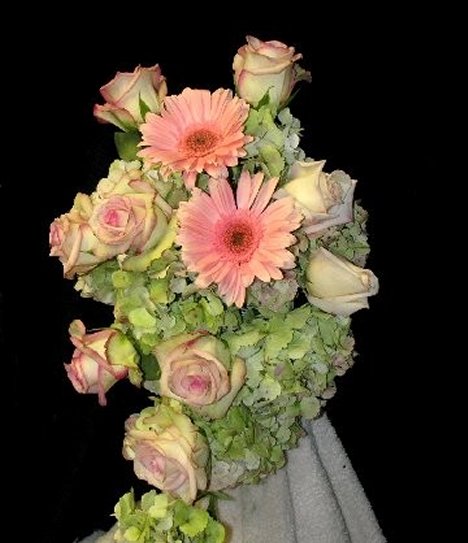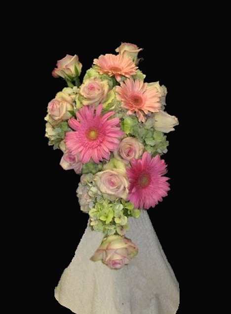 You can add more color contrast by inserting darker pink Gerbera daisies in the lower left. This bouquet can be a finished design. If you want even more pop . . . add the novelty of green flat fern around the circumference of the bouquet.