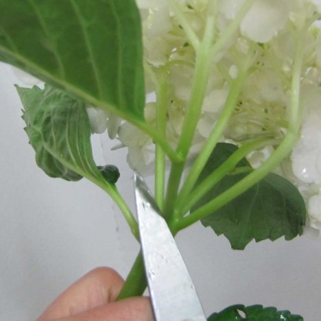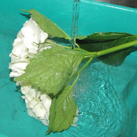 Hydrangeas love a good soak in a tepid bath before using in floral designs. Some florists pierce the woody stem with a needle to allow more water to be drawn up the stem.