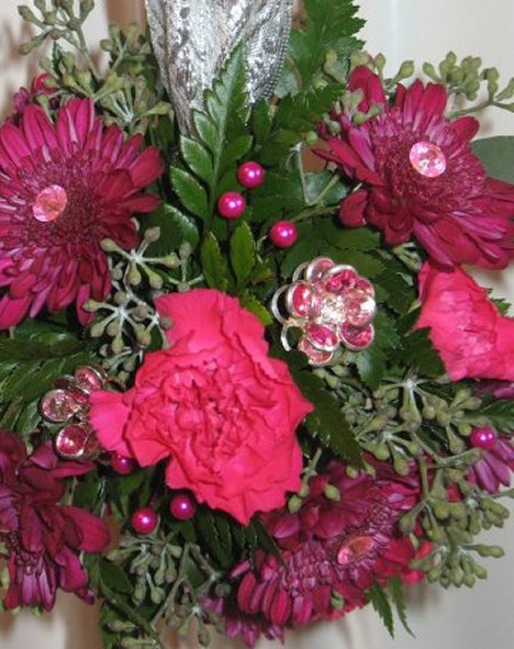 Diamante Pins come in clear, pink, light blue, red and apple green. See how they add sparkle to the heads of the burgundy mums? What I especially like is that they are not backed with foil, like some rhinestones are. Foil looks black in photographs, causing ugly black spots rather than a shine in pictures.