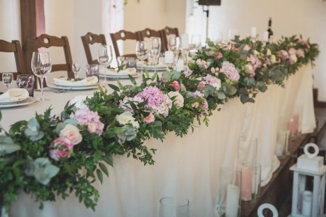 Shown in the picture below is two 8 foot banquet tables serving as a head table. The makes a total of 16 foot (192 inches) so seven 27" raquettes can be lined down the table. Each raquette (27") needs about 6 hydrangeas and 8 roses and any small filler flowers if you wish.
