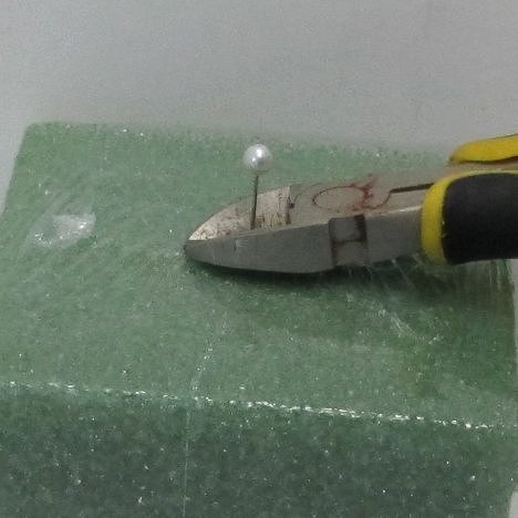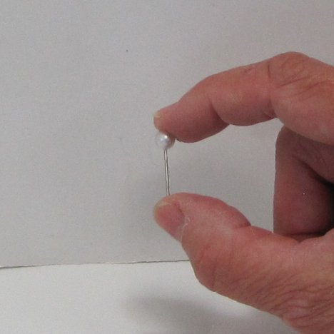 I cut corsage pins down to a shorter length. Please take precautions to do this correctly, as the sharp tips could cause injuries. Always wear eye protection and insert the steel shank into a stiff block of styrofoam and hold the pearl ends firmly between two fingers before cutting.