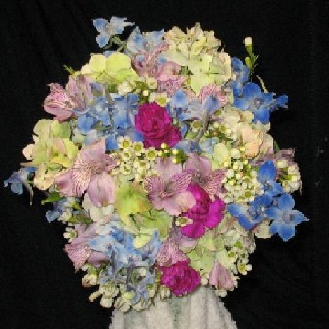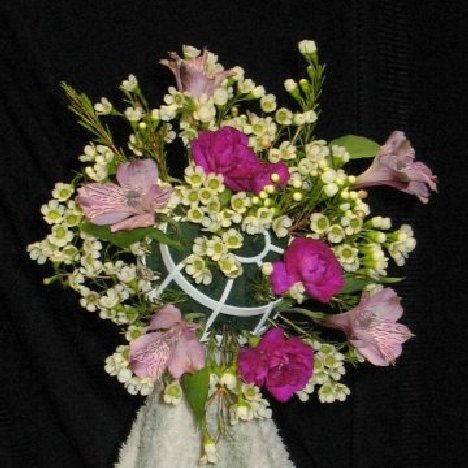So far we've use one stem of wax flower, one stem of miniature carnations and three stems of alstromeria. You can see the bouquet is filling out nicely.
