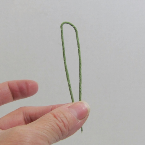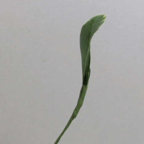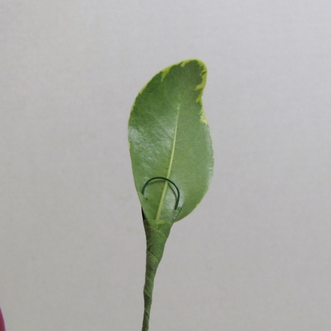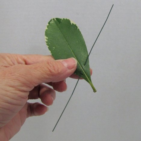 Allow the leaves to dry before handling. I cut off each leaf with a floral knife and then wire with a 26 gauge florist wire. Pierce the leaf as shown.