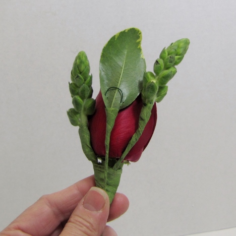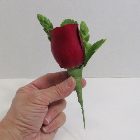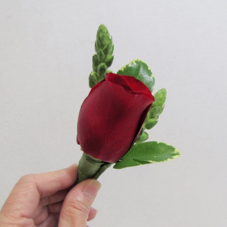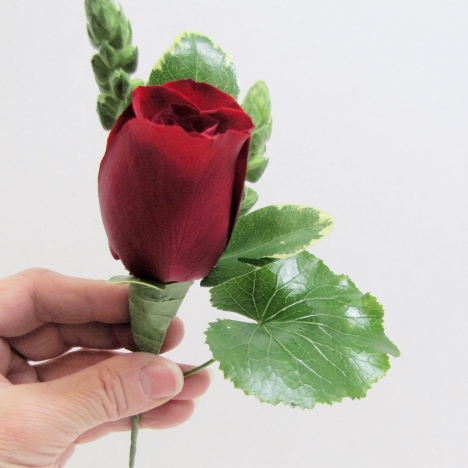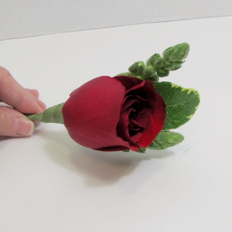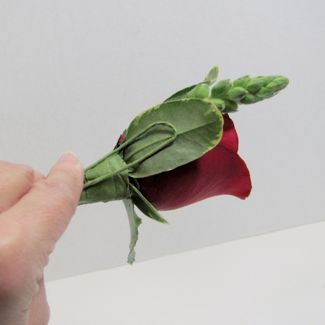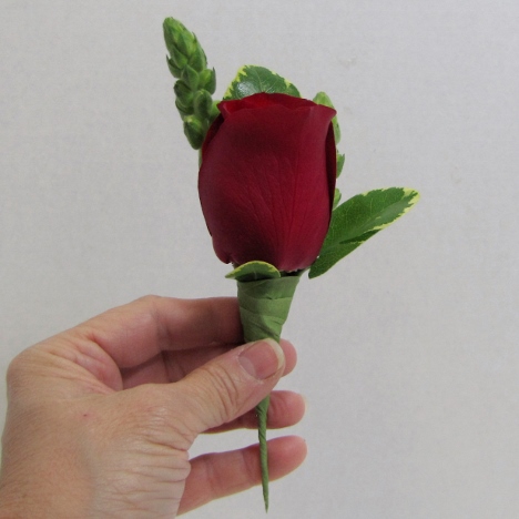 I then tape this hairpin wire on the boutonniere stem and against the leaf.