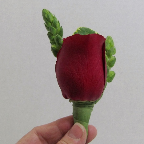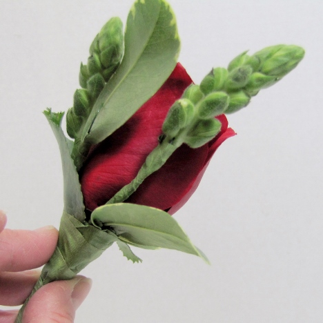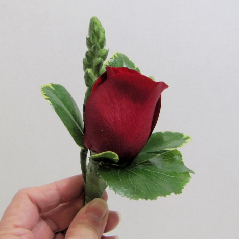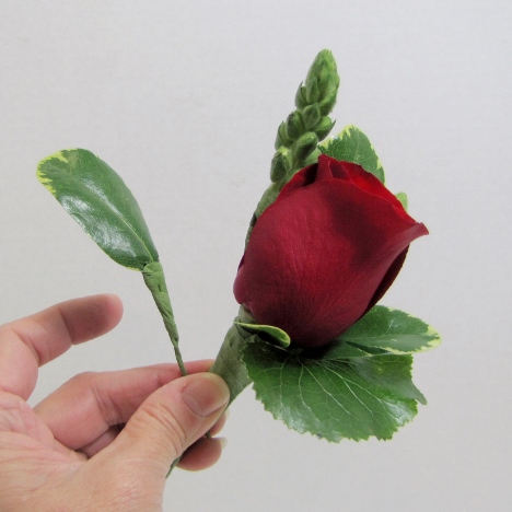 I'm now going to add one more leaf to the left of the rose and then I will add the snapdragon florets on the left side of the boutonniere, opposite the galax leaf.