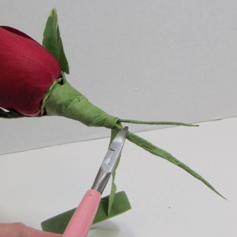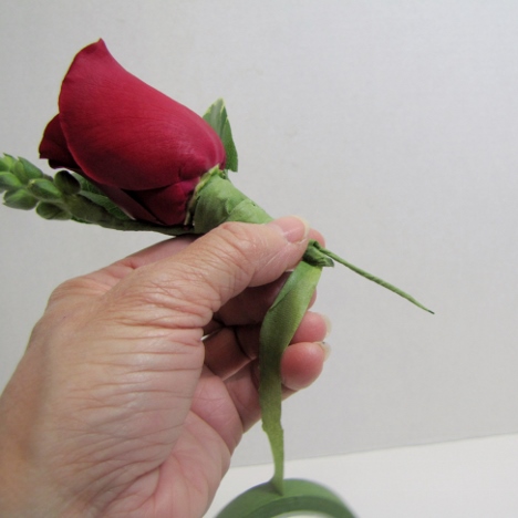 Fit it snugly up to the base of the rose and tape into place with floral tape.