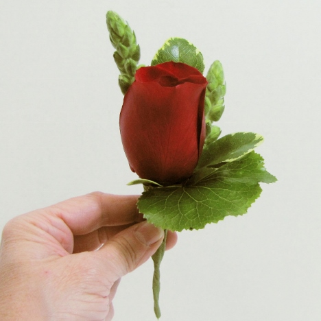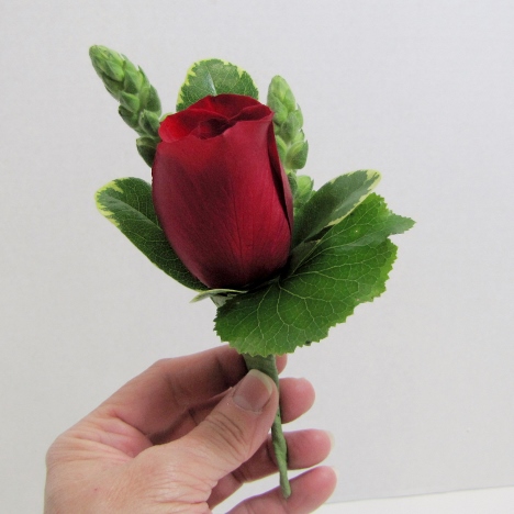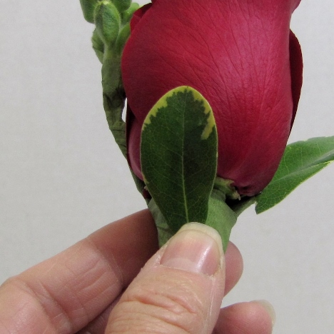 As I make this rose boutonniere, I've decided to add one more pittosporum leaf on the left side.