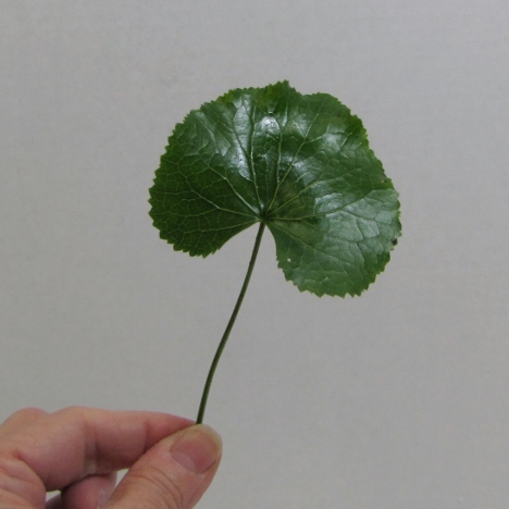 Galax leaves are a circular leaf with a notch right where the leaf stem is joined.