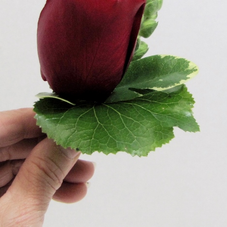Place the first wired pittosporum leaf on the backside so that the leaf peaks out over the top of the rose.