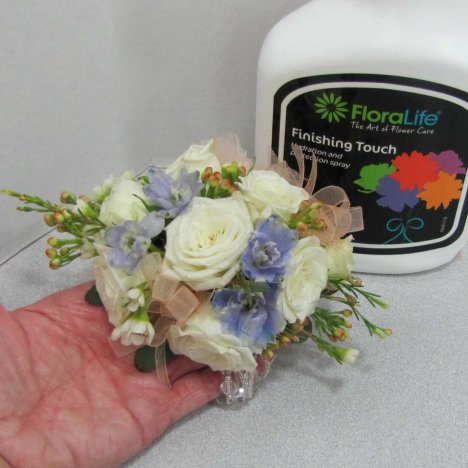 The final step to any boutonniere or corsage is a good misting with a flower sealant such as Finishing Touch. This is important for DIY brides, because home refrigerators pull moisture OUT of the air (instead of putting it into the air like a professional florist cooler).