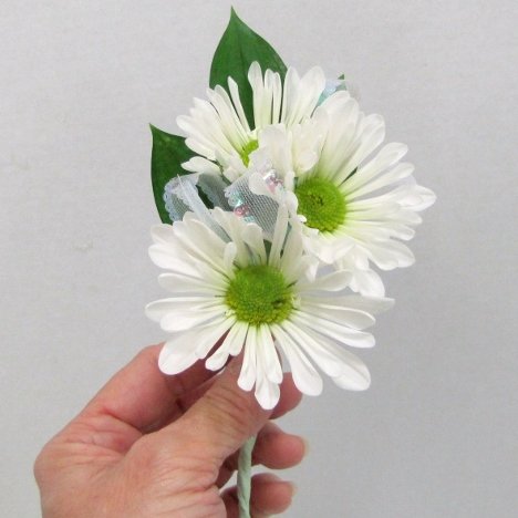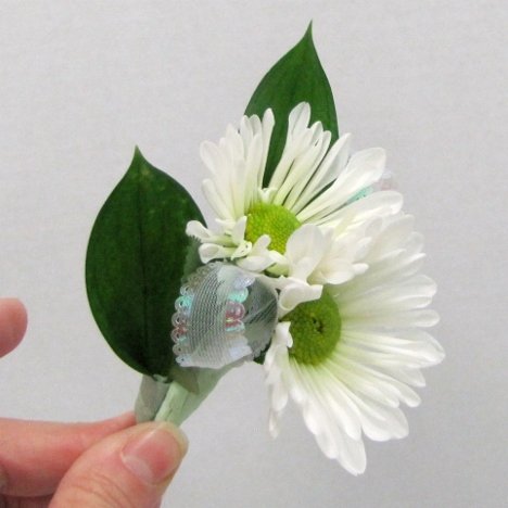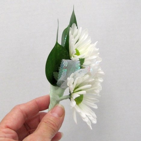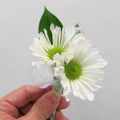 Simple one flower corsages can have added interest by creating a mix of greenery. I started with white daisies and added Israeli Ruscus and ribbon loops.