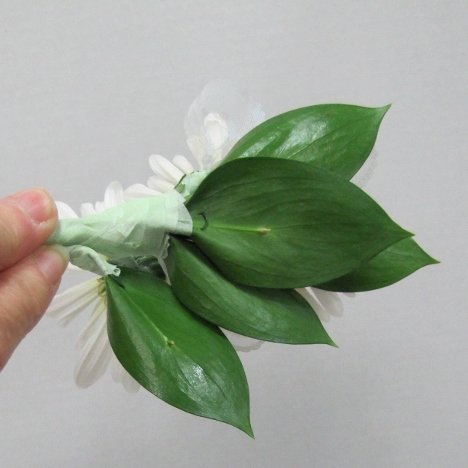 The leafs should peek out from behind the flower heads, framing the back of the corsage.
