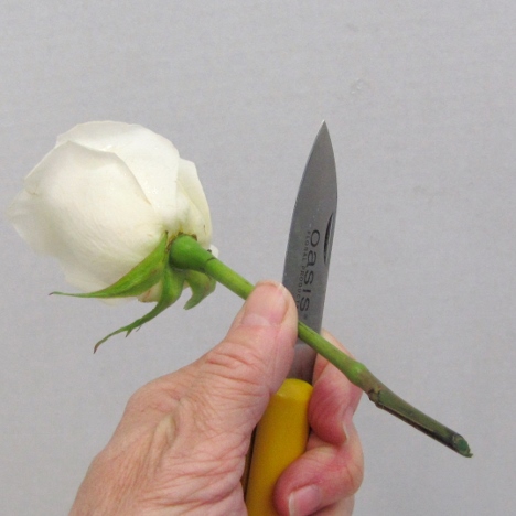 Cut the stems off short (about 1" to 1 1/2" below the calyx) with a sharp knife. Scissors can have a hard time cutting through the tough, slippery skin of a rose. Be sure to remove any thorns.