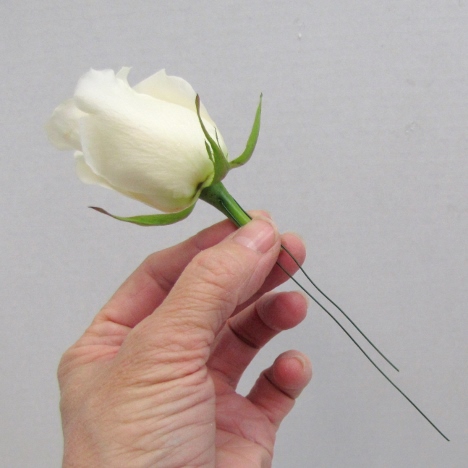 Roses are prepared for corsages by pushing a thin wire through the calyx (bulb) of the flower head and bending down to form a new, more slender and flexible stem.