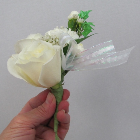 To make corsages look well balanced, I will tuck in another ribbon loop next to the rose.