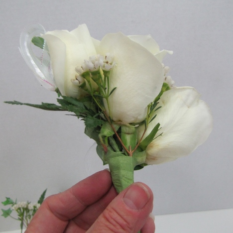 Flowering the corsage is nearly done. Now all remains is to add in some more greenery and ribbon to finish off the bottom.