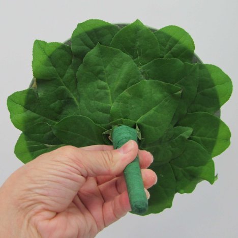 The backs and handles can be concealed with leaves and the cut stems of the flowers gathered around the handle if you wish to imitate the look of a hand tied bouquet. For this particular bouquet, I wrapped the handle with a golden diamond wrap.