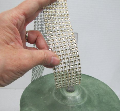 You can use double sticky tape or (as shown below) Uglu dots or strips to attach ribbon or diamond wrap to your bouquet handle.