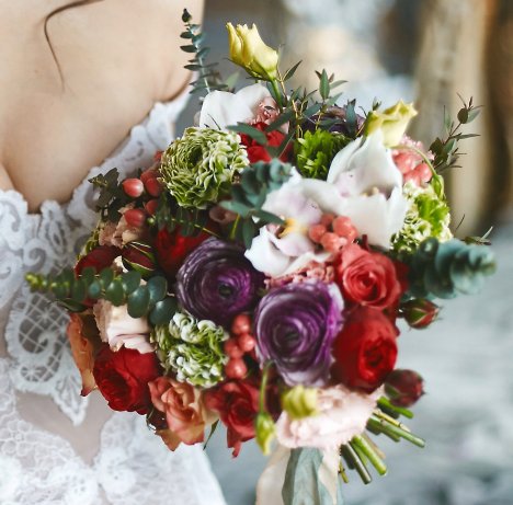 Want to make your own bridal bouquet? You can create a multi-colored hand tied design similar to this one, even changing flowers or greens it to suit your own color theme. This bouquet needs the following products: