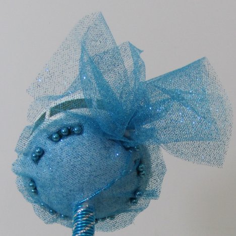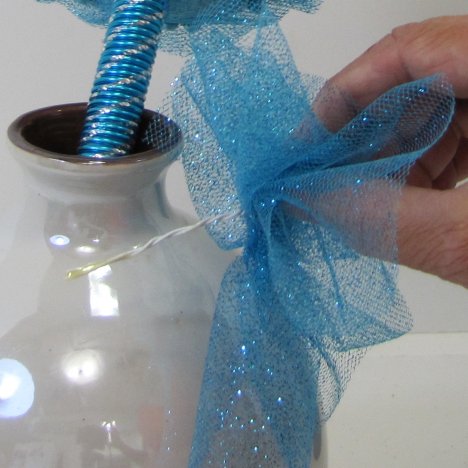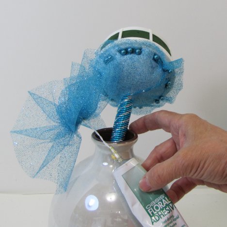 Dip the twisted wire stem of the tulle puff down into the neck of the tube of floral adhesive, coating it well as shown.