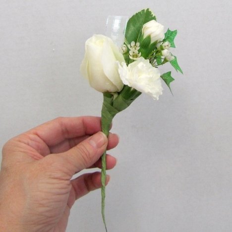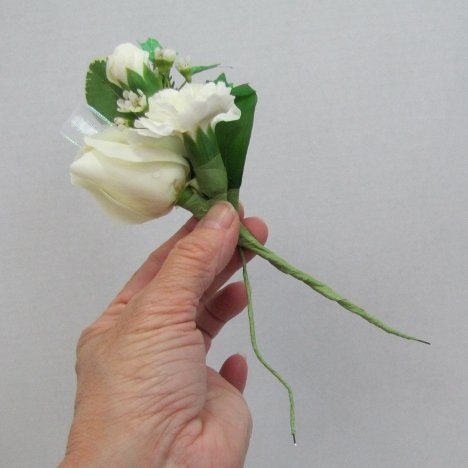 Note that the carnation is taped on the right side and the head dropped down a little lower than the rose on the left.