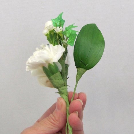 The stem of the leaf is actually going to cross under the corsage stems in a definite "X" pattern. I want the flowers to spray out gently from the top, not be straight up and down.