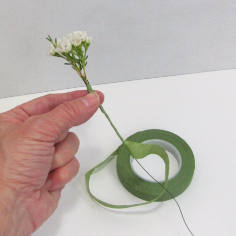 Tape tightly with corsage tape, pulling it taut as you twist it down the stem. It will adhere to itself.