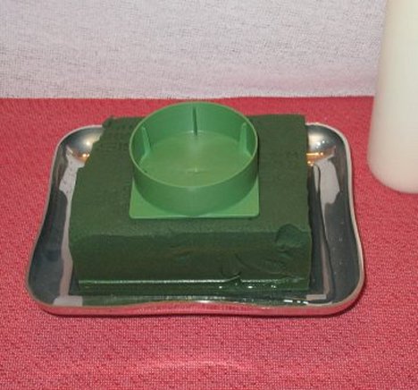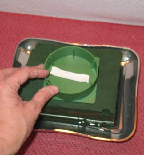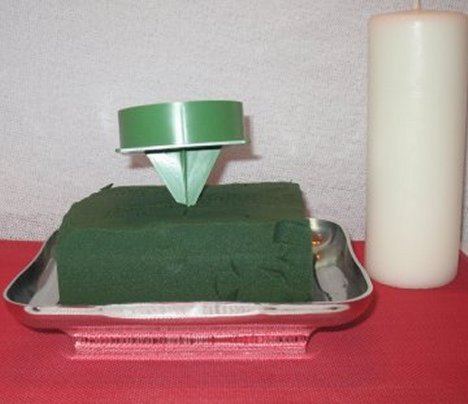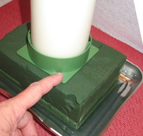 Floral designing is all about attention to details. Notice how the edges of the foam extend beyond the pillar candle stake. If it didn't, you would have a hard time inserting flowers straight up they way they need to be in order to conceal the stake.